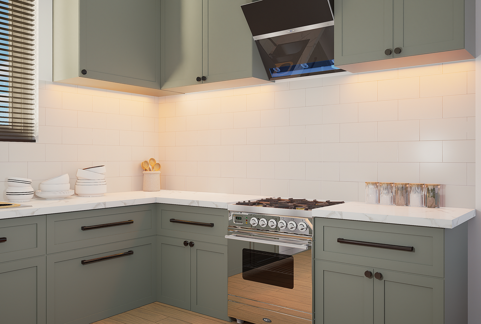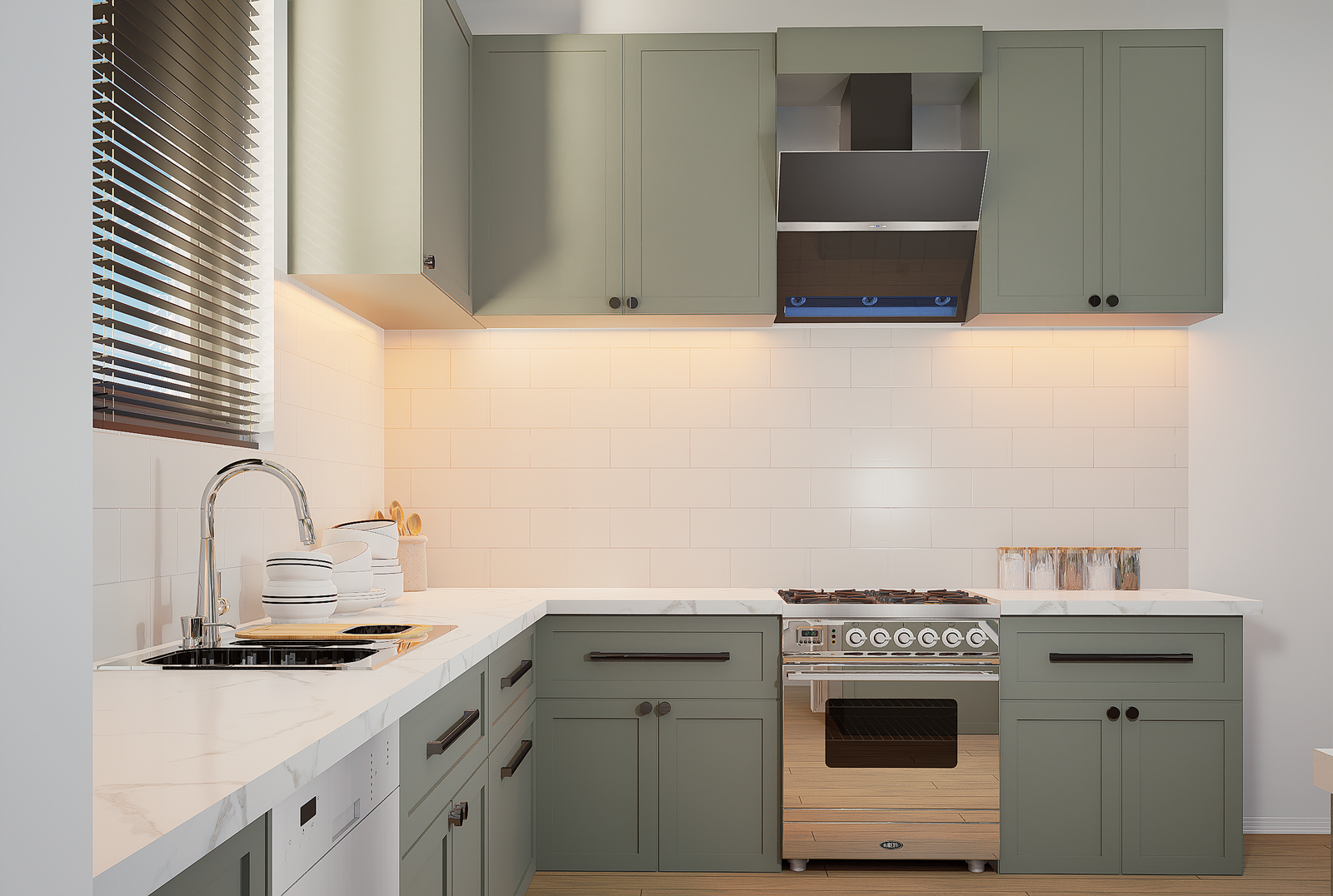 The philosophy driving Culinary Horizon is that a kitchen should be the warm, functional heart of the home. Our concept centers on the “Balanced Contrast,” strategically blending matte color, white countertops, and metallic accents. The design narrative tells a story of refined country charm meeting urban functionality. We selected a deep sage green for the base cabinetry and upper wall units, a choice that feels both historic and highly contemporary. This color is intentionally paired with a classic white subway tile backsplash and white marble/quartz countertops, creating a crisp, clean break that highlights the food preparation zones. The central innovation is the custom integration of a commercial-grade, stainless-steel range which acts as a focal point, its industrial aesthetic providing a rich, textural contrast to the soft green surrounding cabinetry. This thoughtful process results in a space that is effortlessly chic and fundamentally practical.