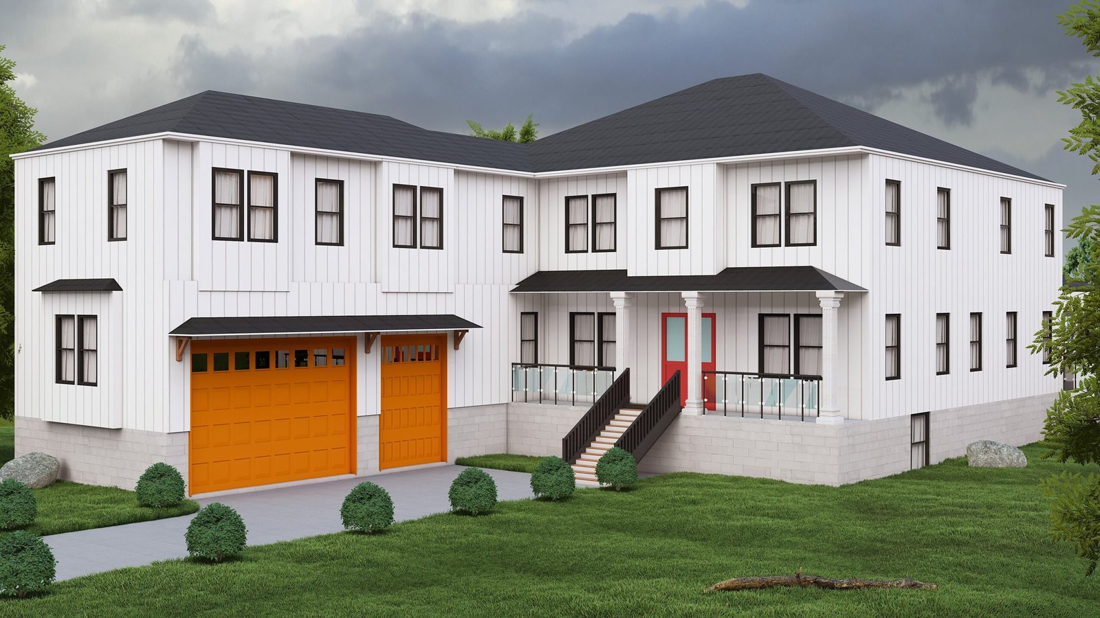 Our design journey for the Beacon Residence began with the evocative image of a lighthouse on a rolling landscape – a beacon of warmth and stability. This concept guided the home’s distinctive L-shaped footprint, allowing it to embrace the natural contours of the site while creating a protected, central outdoor space. We aimed to create a design that felt both grand and welcoming, a place where memories are forged against a backdrop of thoughtful aesthetics. The “modern farmhouse” idiom provided the perfect stylistic framework, allowing for clean lines and simple massing, which we then elevated with strategic bursts of color and texture. The interplay of white vertical siding with dark window frames establishes a classic yet crisp visual dialogue, while the vibrant orange garage doors serve as a bold, unexpected focal point, injecting personality and contemporary flair into the traditional form. It’s a design narrative that celebrates comfort and sophistication, encouraging residents to feel grounded yet inspired.