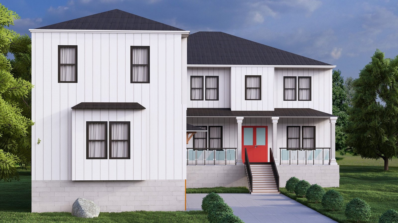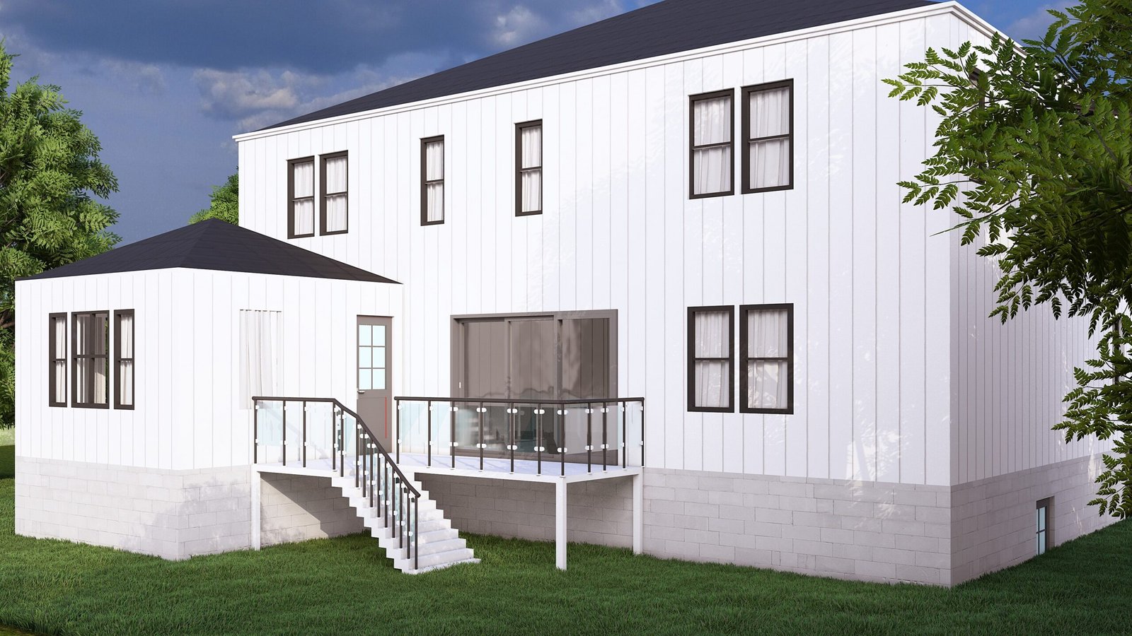 Entry and Fenestration: The main entrance is elevated, accessed by a prominent staircase with contemporary glass railings, emphasizing a grand arrival. A welcoming porch supported by classic columns offers a transitional space. Windows are thoughtfully distributed across the facade, ensuring ample natural light penetration into the interior spaces while contributing to the overall balanced composition. A variety of window sizes and groupings respond to internal functions, from single openings to multiple units grouped for expansive views.