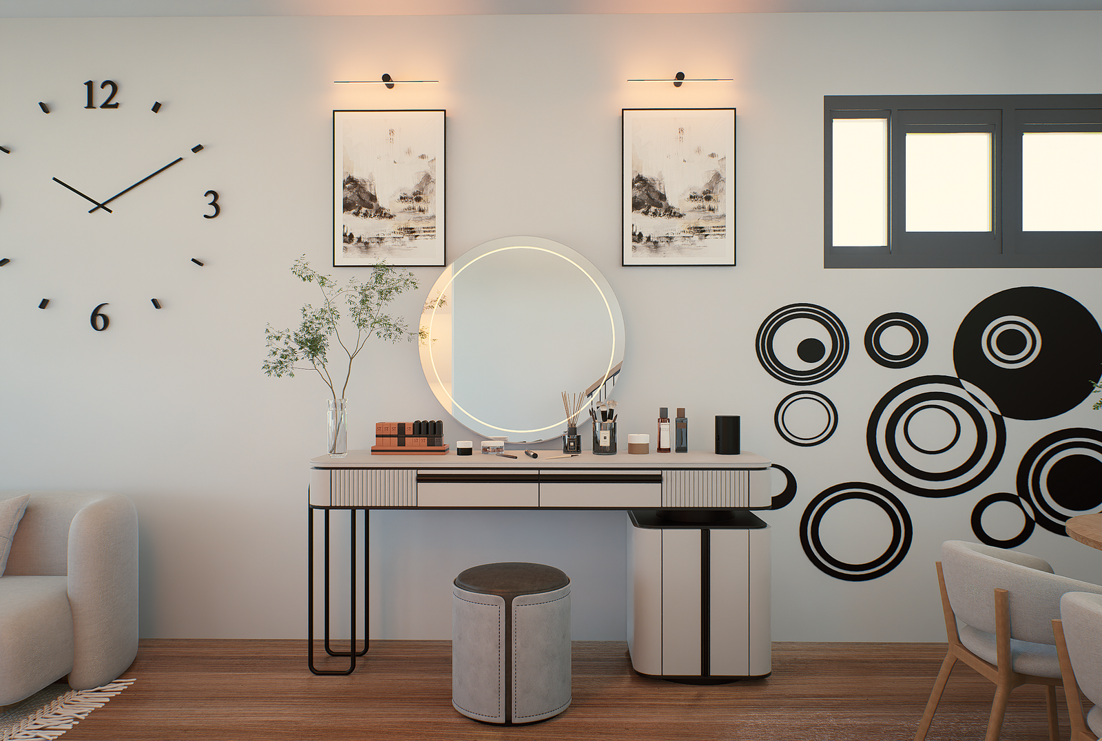 • Wall Articulation: A bold black-and-white geometric circular decal on the dining area wall provides a strong artistic anchor, lending the space a unique, playful identity.