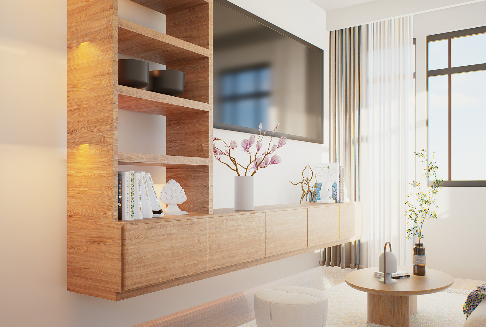 • Furnishings: The dining area features a light wood oval table and upholstered, wood-framed chairs in a soft grey, maintaining the neutral palette. The living area is characterized by a comfortable, low-profile grey sofa and a custom floating media console in the same light wood, featuring integrated shelving and storage.