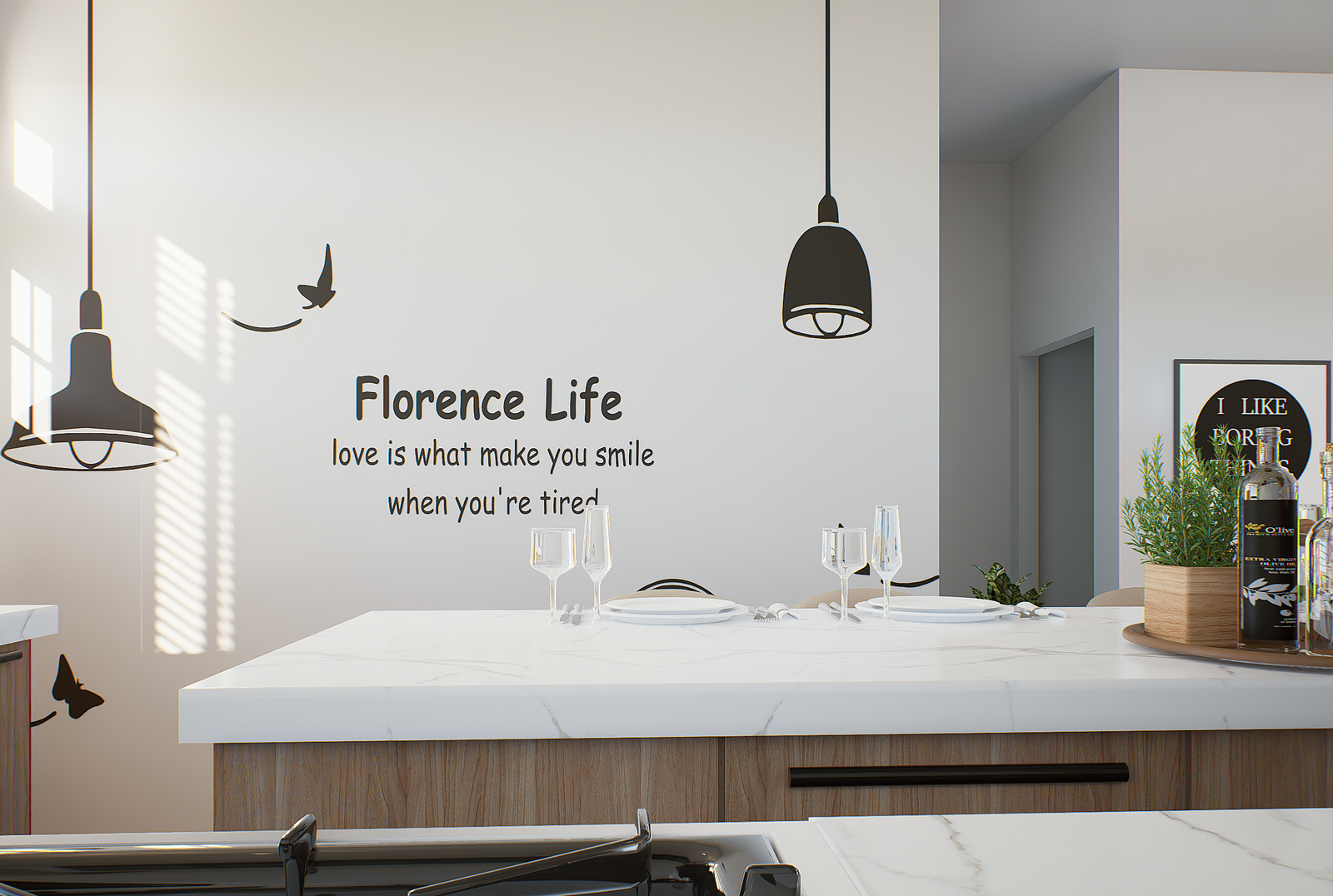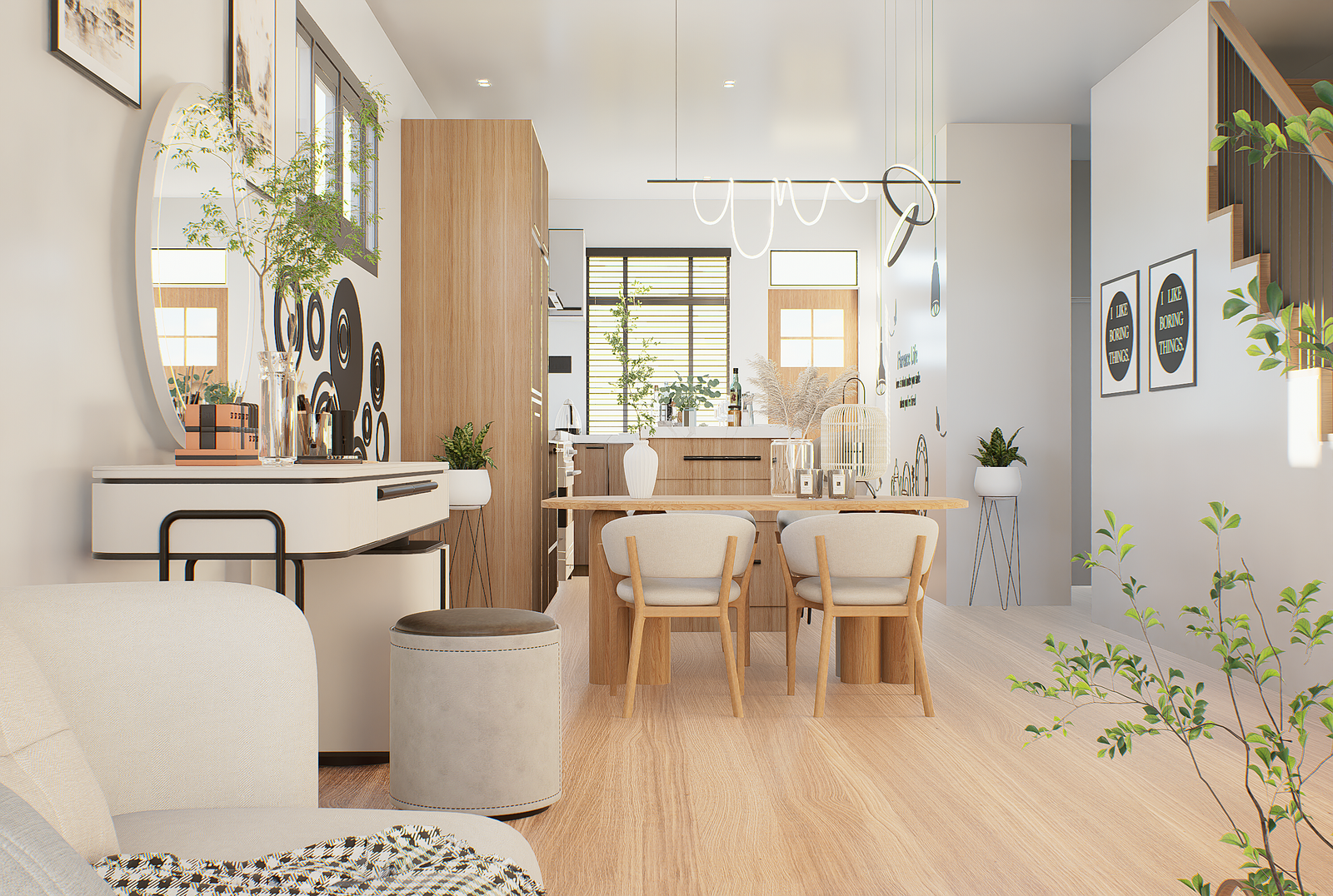 The design philosophy behind Nordic Continuum is “Honest Materials, Flexible Spaces.” Our conceptual approach was to tell a story of modern domesticity where every surface and object contributes to a feeling of calm and quality. We utilized a light wood grain extensively for flooring, cabinetry, and dining furniture, establishing a foundation of natural warmth. This choice grounds the space, contrasting beautifully with the crisp white walls and marble accents. The innovation lies in the intentional visual separation achieved through subtle means: the kitchen island defines the culinary zone, while the oversized graphic wall decal and unique lighting fixture establish the personality of the dining area, and the change in furnishings signals the shift to the living room. This creates a flexible plan where residents can move effortlessly between cooking, dining, and relaxation without ever feeling disconnected.