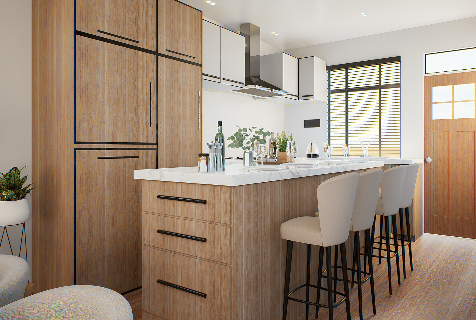 • Cabinetry: Features full-height, flat-panel wood veneer for the pantry/refrigerator wall, contrasted with minimalist white upper cabinets, creating a balanced, modern look.