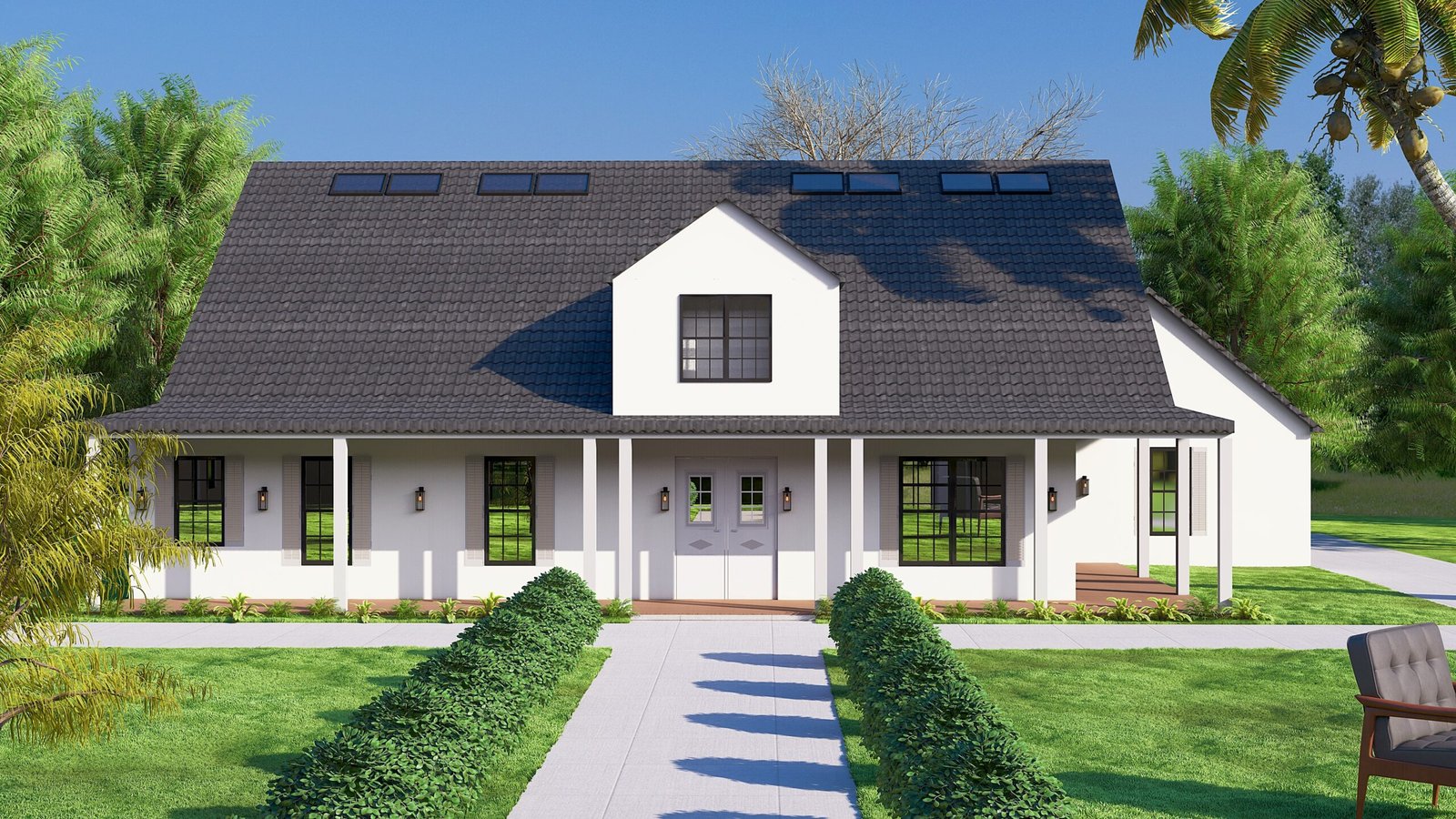 Our design philosophy for Coastal Serenity centered on “Evolved Tradition”—taking the beloved elements of farmhouse style and refining them through a modern lens. The process began by establishing a clear, symmetrical massing, which immediately imparts a sense of stability and classic beauty. The dominant pitched roofline, a hallmark of traditional farm structures, was retained but simplified, with minimal overhangs and a dark metal finish for a contemporary edge. The concept’s storytelling lies in the intentional visual hierarchy: the broad, welcoming front porch extends an invitation, suggesting community and hospitality, while the subtle yet consistent use of dark window frames provides a modern rhythm against the pure white siding, giving the home a crisp, graphic quality. This balance of the nostalgic and the new creates an emotional resonance, making the home feel both comfortingly familiar and distinctly current.