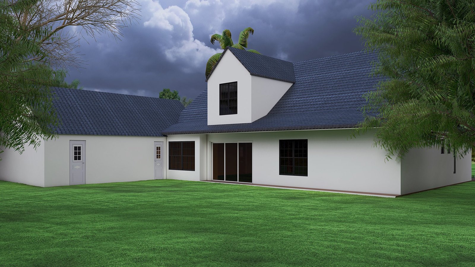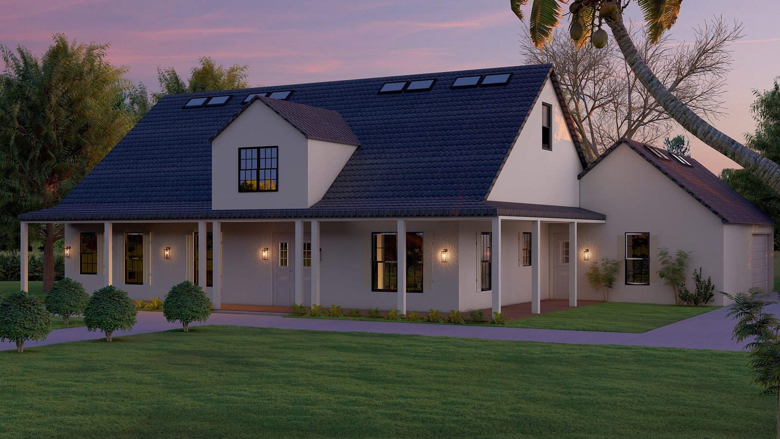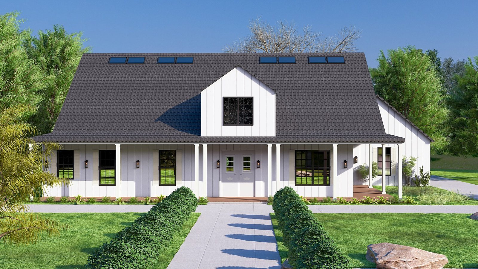 • The expansive roof is finished with dark grey architectural shingles or a standing seam metal, providing a sharp contrast and superior weather resistance.
