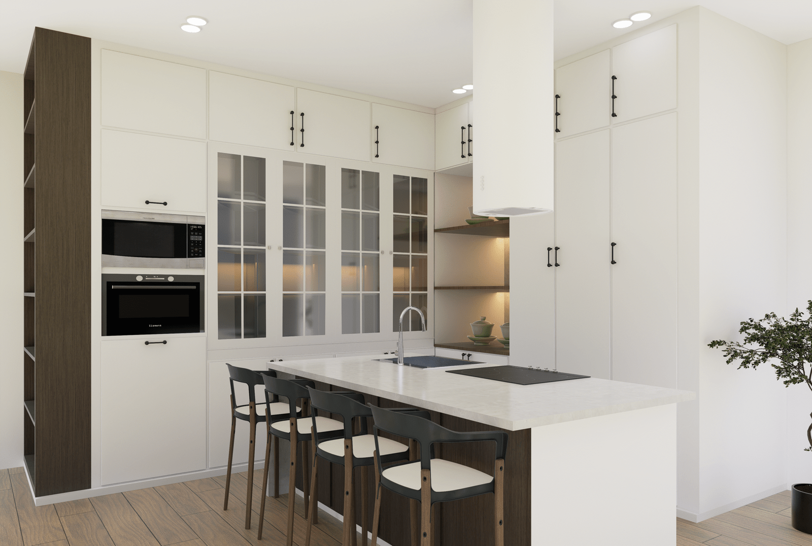Island: Functions as the primary workspace and casual dining area, topped with a pristine white quartz or marble surface for durability and contrast. It incorporates a sink, cooktop, and seating for four with dark-toned, high-backed bar stools.