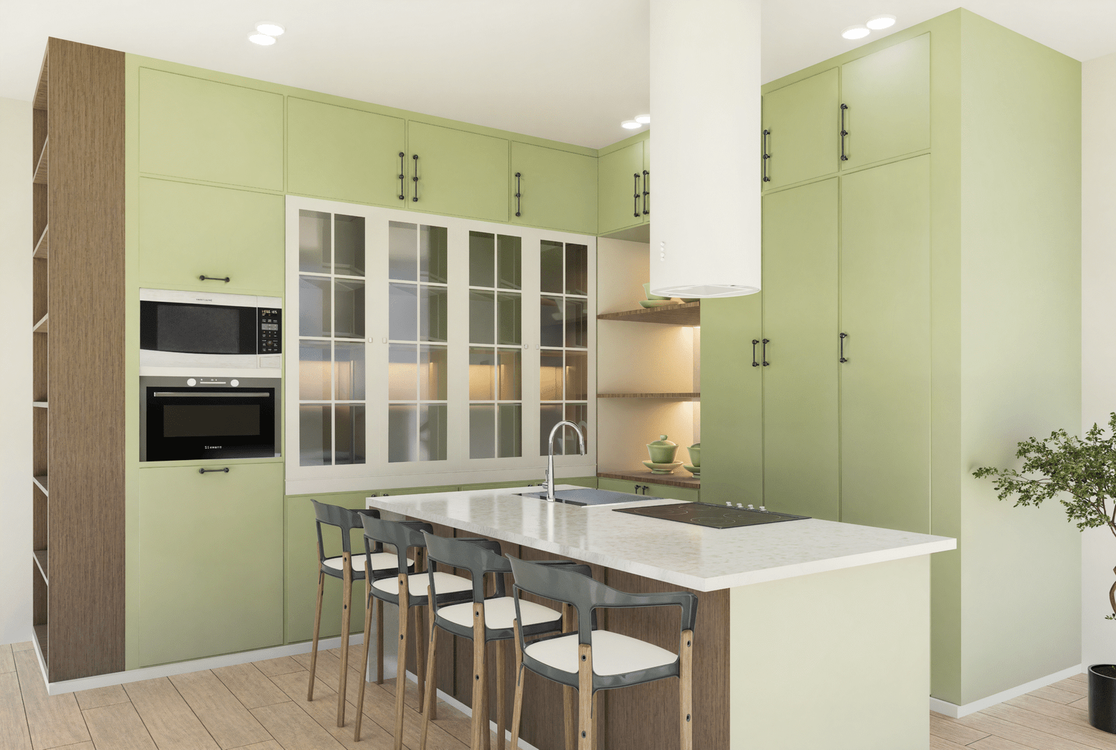 The philosophy driving Vibrant Fusion is that color can be the anchor of a clean, contemporary space. Our concept centers on the “Monolithic Color Block,” utilizing a single, striking color—sage green—for the expansive floor-to-ceiling cabinetry. The design narrative tells a story of grounded elegance: the warmth of the natural wood veneer on the flanking storage tower and island base prevents the green from feeling cold or overwhelming. The central design innovation is the integration of a framed glass-fronted cabinet section above the sink. This feature breaks the monochromatic color block, providing an elegant display area and a visual counterpoint to the solid doors, reminiscent of a classic pantry but executed with modern detailing. The overall thought process balances a desire for bold personal expression with the necessity of clean, functional lines.