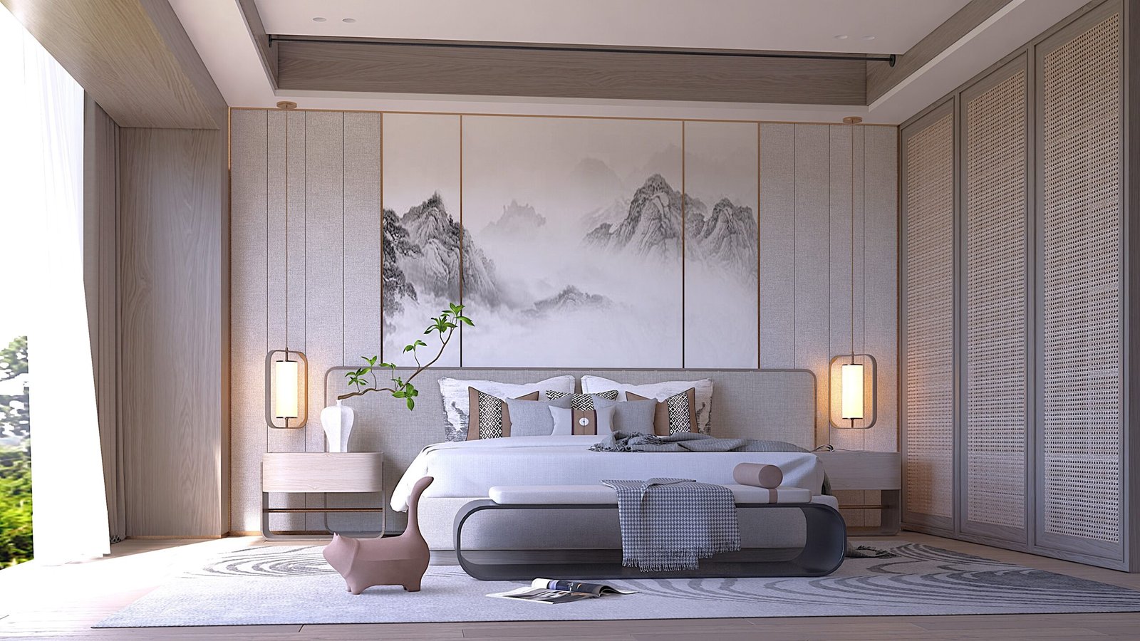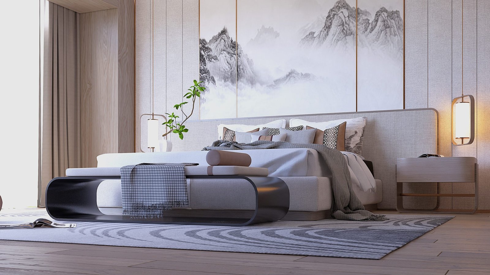 The philosophy underpinning Zen Peaks is that a bedroom should be a haven, a place of ultimate tranquility and aesthetic pleasure. Our concept, “Art as Architecture,” tells a story where the central artwork isn’t merely hung on a wall but is deeply integrated into the very structure of the space. The design process began by envisioning the expansive wall behind the bed as a panoramic canvas, directly interpreting the mist-shrouded mountain peaks of classical Asian art. This mural, composed of multiple panels, serves as the room’s arresting focal point, guiding the entire material and color palette. We then softened the sharp architectural lines with rich textures—the upholstered headboard, the warmth of wooden wall panels, and the plushness of the rug. This thoughtful layering ensures that while the room is minimalist, it is far from stark, offering a sophisticated embrace of nature’s calming power. The overall narrative is one of finding profound peace and contemplation within a beautifully designed contemporary space.